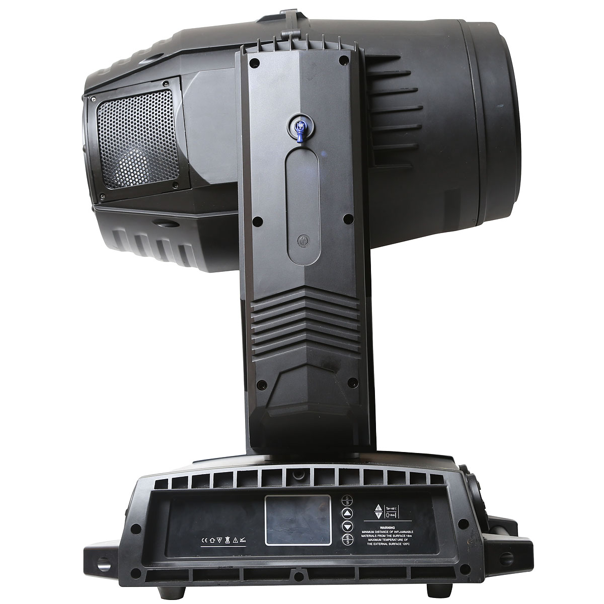 专业商业演出的一款集光束、图案、染色为一体的三合一灯具,防水等级IP55是它的突出亮点,户外使用无需防水罩;针对短弧灯泡的专利调光技术,有效解决了这类灯泡调光过程中光斑不均匀问题;直径154mm的出光镜头,光束饱满粗壮;作为图案灯时,2.4-33°变焦,图案清晰锐利;作为光束灯时,2.2-7°光束角,接近平行光,适合远距离投射; 切入雾化片时,通过镜头移动,6-43°变焦,它又是一款小巧的染色灯。配有CMY无极混色、CTO线性色温调节、一个旋转图案盘、一个固定图案盘、一个动感轮、8+24棱镜,独立频闪、独立调光、独立雾化。